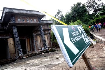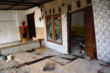 Petugas Badan Penanggulangan Bencana Daerah (BPBD) mendata rumah rusak akibat bencana tanah bergerak di Dusun Sumberlamong, Desa Sambirejo, Kecamatan Wonosalam, Kabupaten Jombang, Jawa Timur, Kamis (7/3/2024). Pergerakan tanah yang terjadi pada Rabu (6/3/2024) tengah malam saat hujan deras itu mengakibatkan 12 rumah dan fasilitas umum rusak, akses jalan terputus dan puluhan warga terdampak mengungsi ke tempat yang aman. ANTARA FOTO/Syaiful Arif/foc.