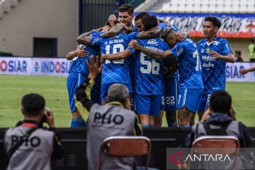 Sejumlah pesepak bola Persib Bandung berselebrasi usai mencetak gol ke gawang Persija Jakarta saat pertandingan lanjutan BRI Liga 1 di Stadion Si Jalak Harupat, Kabupaten Bandung, Jawa Barat, Sabtu (9/3/2024). Dua gol David da Silva bawa Persib Bandung menang atas Persija Jakarta dengan skor 2-1. ANTARA FOTO/Novrian Arbi/pras.