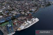 Foto udara Kapal Pesiar MV Seabourn Sojourn sandar di Pelabuhan Ahmad Yani Ternate, Kota Ternate, Maluku Utara, Rabu (13/3/2024). Kapal pesiar berbendera Bahamas yang memiliki panjang 198 meter dan tinggi 25,50 meter tersebut membawa 339 wisatawan dari berbagai negara untuk mengunjungi sejumlah tempat bersejarah di Ternate dan sekitarnya. ANTARA FOTO/Andri Saputra/Spt.