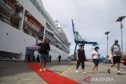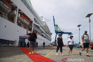 Wisatawan turun dari Kapal Pesiar MV Seabourn Sojourn saat sandar di Pelabuhan Ahmad Yani Ternate, Kota Ternate, Maluku Utara, Rabu (13/3/2024). Kapal pesiar berbendera Bahamas yang memiliki panjang 198 meter dan tinggi 25,50 meter tersebut membawa 339 wisatawan dari berbagai negara untuk mengunjungi sejumlah tempat bersejarah di Ternate dan sekitarnya. ANTARA FOTO/Andri Saputra/Spt.