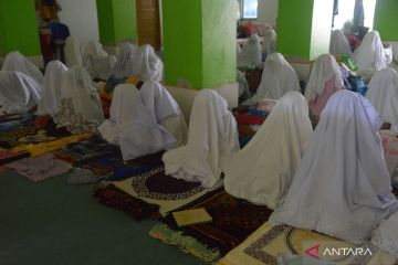 Jemaah perempuan menutupi kepalanya dengan selendang dan kain saat mengikuti ibadah suluk di Dayah Darul Aman, Desa Lampuuk, Kabupaten Aceh Besar, Aceh, Rabu (13/3/2024). Aktivitas spritual suluk pada bulan Ramadhan diikuti jemaah laki-laki dan perempuan di pesantren tersebut dengan memperbanyak dzikir, shalat sunah, dan ibadah lainnya yang bertujuan membersihkan hati, menyucikan jiwa serta mendekatkan diri kepada Allah SWT. ANTARA FOTO/Ampelsa/aww.