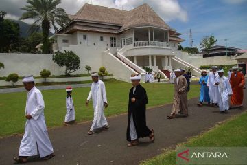 Sejumlah pengurus masjid kesultanan berjalan kaki menuju masjid usai meminta restu kepada Kesultanan untuk melaksanakan shalat Jumat pertama Ramadhan di Masjid Kesultanan Ternate, Kota Ternate, Maluku Utara, Jumat (15/3/2024). Masjid Kesultanan Ternate yang dibangun pada tahun 1606 di masa kekuasaan Sultan Saidi Barakati tersebut masih mempertahankan tradisi bernuansa islami dan memiliki keunikan tersendiri dan sebelum memasuki ibadah shalat Jumat, bedug akan ditabuh selama 1 jam tanpa henti yang tidak dimiliki masjid-masjid lain di Ternate. ANTARA FOTO/Andri Saputra/nym.