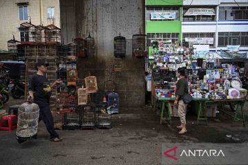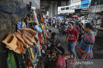 Penjual melayani pembeli di kawasan Pasar Kebayoran Lama, Jakarta, Jumat (15/3/2024). Pemprov DKI Jakarta telah merancang desain penataan kawasan Kebayoran lama yang terbagi menjadi empat blok yakni ruang terbuka hijau fungsional, penataan jalan, penataan taman koridor usaha mikro dan penataan taman transit Kebayoran guna meningkatkan fungsional pada kawasan tersebut. ANTARA FOTO/Erlangga Bregas Prakoso/rwa.
