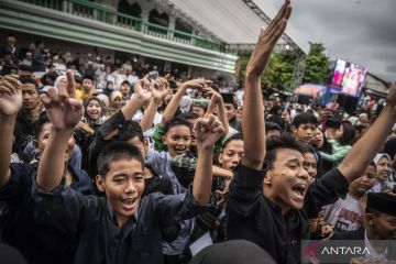 Sejumlah santri menyaksikan penampilan grup band Gigi dalam kegiatan PeaceSantren bertajuk pesan damai dari pesantren di Pondok Pesantren Az-Ziyadah, Jakarta, Sabtu (16/3/2023). Kementerian Agama pada Ramadhan 1445 H menggelar kegiatan PeaceSantren untuk menyebarkan pesan perdamaian dan persaudaraan dari pesantren yang diselenggarakan secara bergiliran di lima kota yakni Jakarta, Jawa Barat, Jawa Tengah, Yogyakarta, dan Jawa Timur. ANTARA FOTO/Aprillio Akbar/aww.