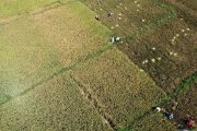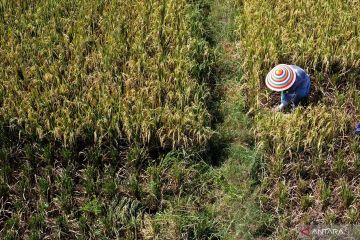 Foto aerial sejumlah petani memanen padi di areal persawahan Kecamatan Kabila, Kabupaten Bone Bolango, Gorontalo, Senin (18/3/2024). Petani di daerah itu mulai melakukan panen padi perdana untuk tahun 2024 yang diharapkan mampu menurunkan harga beras di pasaran yang masih mencapai Rp15 ribu-Rp16 ribu per kg pada bulan Ramadhan 1445 Hijriah. ANTARA FOTO/Adiwinata Solihin/foc.