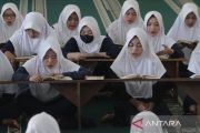Warga binaan mengikuti kegiatan tadarus Al Quran di aula Lapas Perempuan Kelas IIA, Sukun, Malang, Jawa Timur, Selasa (19/3/2024). Pada bulan Ramadhan sejumlah kegiatan keagamaan seperti pesantren kilat, shalat tarawih berjamaah dan tadarus Al Quran diadakan di lapas tersebut guna meningkatkan keimanan sekaligus pembinaan akhlak. ANTARA FOTO/Ari Bowo Sucipto/Spt.