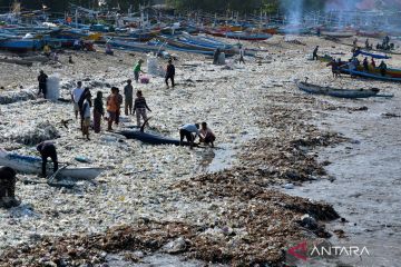 Warga memungut sampah plastik yang berserakan di kawasan Pantai Kedonganan, Badung, Bali, Rabu (20/3/2024). Pantai Kedonganan dipadati sampah plastik kiriman yang terdampar terbawa arus laut yang mengganggu aktivitas warga dan nelayan setempat. ANTARA FOTO/Fikri Yusuf/wpa.