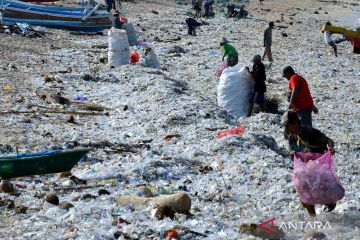 Warga memungut sampah plastik di kawasan Pantai Kedonganan, Badung, Bali, Rabu (20/3/2024). Pantai Kedonganan dipadati sampah plastik kiriman yang terdampar terbawa arus laut yang mengganggu aktivitas warga dan nelayan setempat. ANTARA FOTO/Fikri Yusuf/wpa.