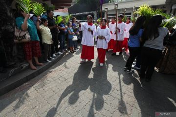 Umat Kristiani mengikuti Misa Minggu Palma di Gereja Katolik Santo Vincentius A Paulo di Jalan Widodaren, Surabaya, Jawa Timur, Minggu (24/3/2024). Misa tersebut merupakan rangkaian perayaan Paskah serta guna memperingati datangnya Yesus di Yerusalem. ANTARA FOTO/Didik Suhartono/foc.