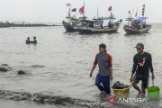 Sejumlah nelayan harus turun ke laut guna mengangkut ikan hasil tangkapannya untuk dibawa ke pelelangan ikan di Teluk Labuan, Pandeglang, Banten, Minggu (24/3/2024). Endapan pasir atau sedimentasi yang terjadi di Teluk Labuan berdampak pada sulitnya akses bongkar muat kapal sehingga para nelayan harus membawa sendiri ikan hasil tangkapan menuju pelelangan. ANTARA FOTO/Muhammad Bagus Khoirunas/Spt.