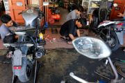 Mekanik memperbaiki sepeda motor konsumen di salah satu bengkel Jalan Terminal, Meulaboh, Aceh Barat, Aceh, Kamis (28/3/2024). Menurut pengusaha bengkel, menjelang Lebaran permintaan jasa servis sepeda motor untuk keperluan mudik mengalami peningkatan dari 15 unit sepeda motor per hari menjadi 40 hingga 55 unit sepeda motor per hari. ANTARA FOTO/Syifa Yulinnas/foc.