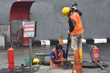 Petugas menguras tangki pendam BBM yang tercampur air di SPBU Jalan Ir Juanda, Bekasi, Jawa Barat, Kamis (28/3/2024). Usai penetapan tiga tersangka yang mencampur bensin dengan air oleh pihak berwajib, pengelola SPBU terus berusaha membersihkan tangki penyimpanan bensin yang tercampur air sehingga layanan operasi penjualan BBM dihentikan sementara. ANTARA FOTO/ Fakhri Hermansyah/foc.