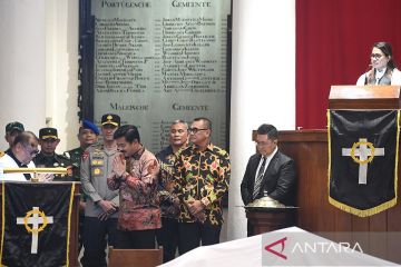 Menko Polhukam Hadi Tjahjanto (kedua kiri) menyampaikan sambutan saat mengunjungi Gereja Protestan Indonesia bagian Barat (GPIB) Immanuel di Jakarta, Jumat (29/3/2024). Kunjungan Hadi Tjahjanto itu untuk memastikan keamanan berlangsungnya ibadah Jumat Agung yang merupakan rangkaian dari Tri Hari Suci Paskah. ANTARA FOTO/M Risyal Hidayat/Spt.