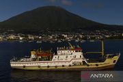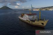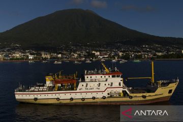 Foto udara Kapal Perintis Sabuk Nusantara 155 bantuan Kementerian Perhubungan berlabuh di sekitar perairan Ternate, Maluku Utara, Minggu (31/3/2024). Kapal perintis yang didatangkan dari Surabaya, Jawa Timur tersebut akan menggantikan KM Kie Raha 02 yang beroperasi di daerah tertinggal, terluar, terdepan, dan perbatasan (3TP) di wilayah Maluku Utara dan menjadi salah satu moda transportasi laut untuk angkutan mudik Lebaran. ANTARA FOTO/Andri Saputra/Spt.