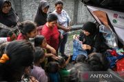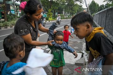 Warga memakaikan baju bekas layak pakai kepada anaknya di Jalan Taman Makam Pahlawan Taruna, Kota Tangerang, Banten, Minggu (7/4/2024). Kegiatan sosial tersebut membagikan sekitar 500 pakaian bekas layak pakai kepada warga yang membutuhkan untuk Lebaran yang dikumpulkan melalui media sosial. ANTARA FOTO/Sulthony Hasanuddin/pras.