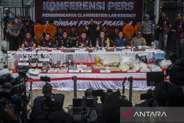 Karopenmas Mabes Polri Brigjen Pol Trunoyudo Wisnu Andiko (depan, ketiga kanan) bersama Direktur Tindak Pidana Narkoba Bareskrim Brigjen Mukti Juharsa (depan, tengah) memberikan keterangan pers terkait pengungkapan laboratorium rahasia pembuatan ekstasi milik bandar narkoba Fredy Pratama di Perumahan Taman Sunter Agung, Tanjung Priok, Jakarta Utara, Senin (8/4/2024). Direktorat Tindak Pidana Narkoba Bareskrim Polri berkerja sama dengan Direktorat Jenderal Bea Cukai (DJBC) serta Bea Cukai Bandara Soetta berhasil mengungkap laboratorium rahasia pembuatan ekstasi yang dikendalikan langsung gembong narkoba Fredy Pratama, dalam penggerebekan petugas berhasil menangkap empat orang tersangka dengan menyita barang bukti berupa 7.800 butir ekstasi, ratusan kilogram bahan baku pembuatan ekstasi, dan uang tunai Rp34 juta. ANTARA FOTO/Galih Pradipta/tom.