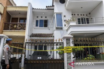 Polisi berjaga di depan rumah tempat pengungkapan laboratorium rahasia pembuatan ekstasi milik bandar narkoba Fredy Pratama di Perumahan Taman Sunter Agung, Tanjung Priok, Jakarta Utara, Senin (8/4/2024). Direktorat Tindak Pidana Narkoba Bareskrim Polri berkerja sama dengan Direktorat Jenderal Bea Cukai (DJBC) serta Bea Cukai Bandara Soetta berhasil mengungkap laboratorium rahasia pembuatan ekstasi yang dikendalikan langsung gembong narkoba Fredy Pratama, dalam penggerebekan petugas berhasil menangkap empat orang tersangka dengan menyita barang bukti berupa 7.800 butir ekstasi, ratusan kilogram bahan baku pembuatan ekstasi, dan uang tunai Rp34 juta. ANTARA FOTO/Galih Pradipta/tom.