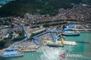 Suasana antrean kendaraan pemudik terpantau melalui foto udara dari helikopter rescue 3606 milik Basarnas di Pelabuhan Merak, Cilegon, Banten, Senin (8/4/2024). Berdasarkan pantauan pada H-2 Lebaran situasi jalan tol terlihat lancar dibandingkan dengan H-3, namun masih terjadi antrean kendaraan yang akan memasuki Pelabuhan Merak. ANTARA FOTO/Rivan Awal Lingga/tom.