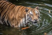Seekor Harimau Benggala (Panthera tigris tigris) bermain di Taman Margasatwa Ragunan, Jakarta, Kamis (11/4/2024). Pihak Taman Margasatwa Ragunan menyatakan akan menambah jam operasional semasa libur Lebaran dari biasanya 07.00-16.00 menjadi 07.00-17.00 untuk mengantisipasi tingginya kunjungan warga, dimana tercatat 69.979 orang memadati Ragunan pada hari kedua Lebaran. ANTARA FOTO/Bayu Pratama S/foc.