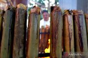 Seorang warga memasak nasi bulu atau lemang dengan menggunakan bara api sabut kelapa di Yosonegoro, Kabupaten Gorontalo, Gorontalo, Selasa (16/4/2024). Nasi bulu atau lemang merupakan kudapan khas warga Jawa Tondano pada Lebaran Ketupat yang dirayakan satu pekan setelah Idul Fitri. ANTARA FOTO/Adiwinata Solihin/aww.