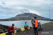Personel Basarnas (Badan SAR Nasional) mengamati gunung Ruang dari dermaga pelabuhan Tagulandang, Kabupaten Kepulauan Sitaro (Siau, Tagulandang, Biaro), Sulawesi Utara, Kamis (18/4/2024). Data dari PVMBG (Pusat Vulkanologi dan Mitigasi Bencana Geologi) menyebutkan dalam kurun waktu 24 jam terakhir sudah terjadi lima kali erupsi dengan ketinggian 1.800 meter hingga 3.000 meter dari puncak Gunung Ruang yang menimbulkan suara gemuruh, gempa, dan kilatan petir vulkanik. ANTARA FOTO/HO-Basarnas/adw/wpa.