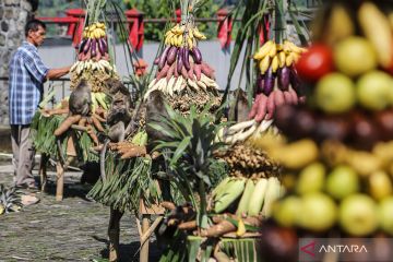 Warga dan sejumlah kera mengambil gunungan hasil bumi yang disajikan dalam kirab budaya tradisi Sesaji Rewanda di Goa Kreo, Gunungpati, Semarang, Jawa Tengah, Sabtu (20/4/2024). Tradisi yang digelar Dinas Kebudayaan dan Pariwisata Kota Semarang setiap bulan Syawal tersebut untuk mengenang napak tilas Kanjeng Sunan Kalijaga saat mencari kayu jati yang akan digunakan untuk membangun tiang atau Soko Guru Masjid Agung Demak yang dibantu kawanan kera di Goa Kreo, sekaligus sebagai upaya meningkatkan kunjungan wisatawan. ANTARA FOTO/Makna Zaezar/aww.