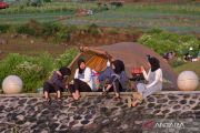 Wisatawan berkemah di areal Embung Bansari kawasan lereng Gunung Sindoro, Bansari, Temanggung, Jawa Tengah Minggu (21/4/2024). Menurut pengelola selama musim libur panjang Lebaran 2024, wisata alam Embung Bansari yang berada di ketinggian 1.300 mdpl itu menjadi tujuan destinasi wisata ribuan wisatawan dari berbagai daerah untuk berkemah dan berwisata. ANTARA FOTO/Anis Efizudin/YU