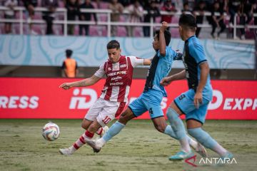 Pesepak bola Persis Solo Alexis Nahuel Messidoro (kiri) berebut bola dengan pesepak bola Persikabo 1973 Syahrul R Lasinari (kedua kanan) pada pertandingan BRI Liga I di Stadion Manahan, Solo, Jawa Tengah, Senin (22/4/2024). Persis Solo menang atas Persikabo 1973 dengan skor 2-1. ANTARA FOTO/Mohammad Ayudha/YU