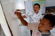 Seorang warga binaan pemasyarakatan (WBP) menjadi tenaga pengajar baca tulis di Lembaga Pemasyarakatan (Lapas) Kelas IIA, Kota Gorontalo, Gorontalo, Selasa (23/4/2024). Lapas Kelas IIA Gorontalo menjalankan program pemberantasan buta aksara yaitu membaca dan menulis bagi warga binan yang dilakukan empat kali dalam satu pekan yang diikuti oleh 30 orang dan dibagi dalam dua kelas belajar. ANTARA FOTO/Adiwinata Solihin/rwa.