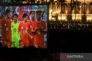 Sejumlah pendukung Timnas Indonesia U-23 menyaksikan pertandingan semifinal Piala Asia U-23 antara Timnas Indonesia melawan Uzbekistan di Lapangan Banteng, Jakarta, Senin (29/4/2024). Sejumlah wilayah di Indonesia menggelar nonton bareng (nobar) pertandingan tersebut sebagai bentuk dukungan bagi Timnas U-23. ANTARA FOTO/Muhammad Adimaja/tom.