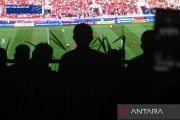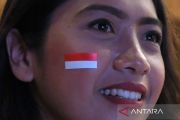 Seorang perempuan memasang stiker bendera Merah Putih di pipinya saat nonton bareng pertandingan Timnas Indonesia U-23 melawan Timnas Uzbekistan U-23 di Gedung Dharma Negara Alaya, Denpasar, Bali, Senin (29/4/2024). Kegiatan yang digelar oleh Pemkot Denpasar tersebut mengajak masyarakat untuk mendukung Timnas Indonesia U-23 yang berlaga melawan Timnas Uzbekistan U-23 pada semifinal Piala Asia U-23 di Stadion Abdullah bin Khalifa, Doha, Qatar. ANTARA FOTO/Nyoman Hendra Wibowo/tom.