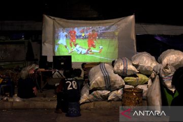 Warga menyaksikan pertandingan semifinal Piala Asia U-23 antara Timnas Indonesia melawan Uzbekistan melalui sebuah layar di lapak pemulung di kawasan Jalan Raya Tanjung Barat, Jakarta, Senin (29/4/2024). Antusiasme warga melalui kegiatan nobar (nonton bareng) dilakukan berbagai daerah untuk mendukung Timnas Indonesia U-23 yang berlaga dalam pertandingan tersebut. ANTARA FOTO/Indrianto Eko Suwarso/tom.