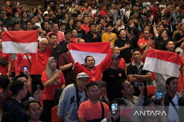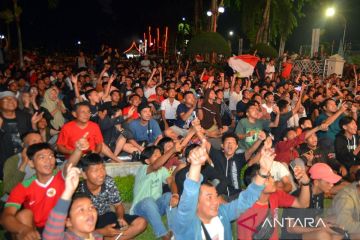 Warga menyanyikan lagu Indonesia Raya saat nonton bareng pertandingan Timnas Indonesia U-23 melawan Timnas Uzbekistan U-23 di Gedung Dharma Negara Alaya, Denpasar, Bali, Senin (29/4/2024). Kegiatan yang digelar oleh Pemkot Denpasar tersebut mengajak masyarakat untuk mendukung Timnas Indonesia U-23 yang berlaga melawan Timnas Uzbekistan U-23 pada semifinal Piala Asia U-23 di Stadion Abdullah bin Khalifa, Doha, Qatar. ANTARA FOTO/Nyoman Hendra Wibowo/tom.