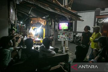 Warga menyaksikan pertandingan semifinal Piala Asia U-23 antara Timnas Indonesia melawan Uzbekistan melalui televisi di warung angkringan Laweyan, Solo, Jawa Tengah, Senin (29/4/2024). Warga antusias menyaksikan pertandingan Semifinal Piala Asia U-23 untuk mendukung Timnas Indonesia yang bertanding melawan Timnas Uzbekistan di Stadion Abdullah bin Khalifa, Doha, Qatar. ANTARA FOTO/Mohammad Ayudha/tom.