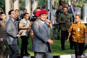 Menteri Pertahanan sekaligus Presiden terpilih Prabowo Subianto (tengah) berjalan saat menghadiri apel peringatan HUT ke-72 Kopassus di Mako Kopassus, Cijantung, Jakarta, Selasa (30/4/2024). Perayaan tersebut mengangkat tema Mengabdi Dengan Kehormatan Pelindung Sejati Kedaulatan. ANTARA FOTO/Asprilla Dwi Adha/foc.