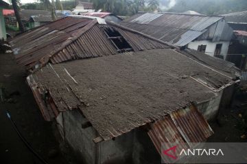 Kondisi rumah warga yang rusak akibat erupsi Gunung Ruang di Tagulandang, Kabupaten Kepulauan Sitaro, Sulawesi Utara, Kamis (2/5/2024). BPBD mencatat sebanyak 3.614 unit rumah mengalami kerusakan di Tagulandang yang tersebar di dua kelurahan dan 13 kampung akibat erupsi Gunung Ruang. ANTARA FOTO/Andri Saputra/tom.