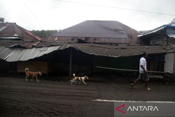 Warga melintas di depan rumah yang rusak akibat erupsi Gunung Ruang di Tagulandang, Kabupaten Kepulauan Sitaro, Sulawesi Utara, Kamis (2/5/2024). BPBD mencatat sebanyak 3.614 unit rumah mengalami kerusakan di Tagulandang yang tersebar di dua kelurahan dan 13 kampung akibat erupsi Gunung Ruang. ANTARA FOTO/Andri Saputra/tom.