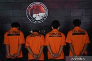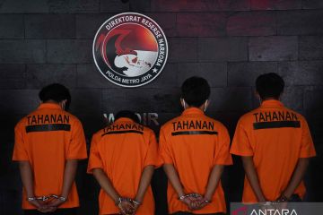 Sejumlah tersangka dihadirkan saat rilis pengungkapan kasus laboratorium terselubung narkotika jenis MDMB-4en-PINACA atau ganja sintesis di Polda Metro Jaya, Jakarta, Kamis (2/5/2024). Polisi berhasil menangkap lima orang tersangka yang beroperasi di sebuah perumahan elit di kawasan Sentul dengan barang bukti ganja sintesis siap edar serta sejumlah bahan dan alat produksinya. ANTARA FOTO/Akbar Nugroho Gumay/YU