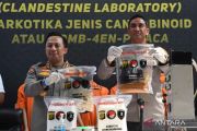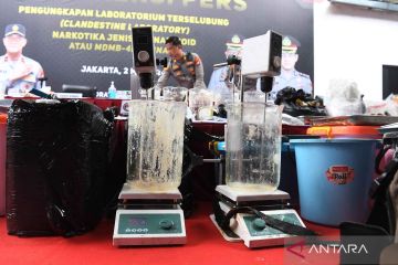 Petugas menyiapkan barang bukti sebelum berlangsungnya rilis pengungkapan kasus laboratorium terselubung narkotika jenis MDMB-4en-PINACA atau ganja sintesis di Polda Metro Jaya, Jakarta, Kamis (2/5/2024). Polisi berhasil menangkap lima orang tersangka yang beroperasi di sebuah perumahan elit di kawasan Sentul dengan barang bukti ganja sintesis siap edar serta sejumlah bahan dan alat produksinya. ANTARA FOTO/Akbar Nugroho Gumay/YU