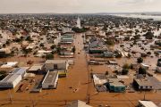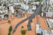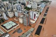 Foto udara situasi banjir di pusat kota Porto Alegre, Rio Grande do Sul, Brazil, Minggu (5/5/2024). Banjir di Brazil menewaskan lebih dari 70 warga sementara lebih dari 100 lainnya dilaporkan hilang. ANTARA FOTO/REUTERS/Renan Mattos/foc.