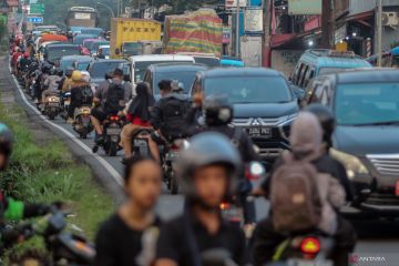 Kepadatan kendaraan saat diberlakukan sistem satu arah di Jalan Raya Puncak, Cisarua, Kabupaten Bogor, Jawa Barat, Jumat (10/5/2024). Polres Bogor melakukan rekayasa lalu lintas sistem satu arah untuk mengatasi kepadatan di jalur wisata Puncak Bogor pada momen libur panjang. ANTARA FOTO/Yulius Satria Wijaya/foc.