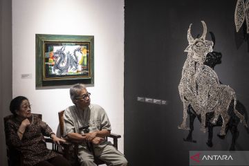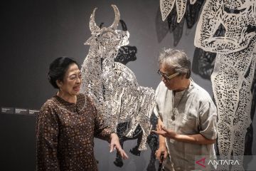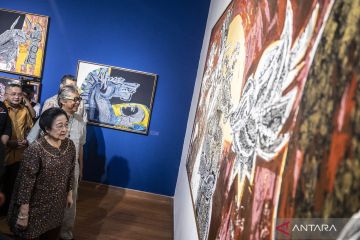 Ketua Umum PDI Perjuangan Megawati Soekarnoputri (kanan) didampingi seniman Butet Kartaredjasa (kanan) meninjau Pameran Seni Rupa Butet Kartaredjasa Melik Nggendong Lali di Galeri Nasional, Jakarta, Senin (13/5/2024). Megawati Soekarnoputri menilai karya seni yang ditampilkan dalam pameran tunggal Butet Kartaredjasa itu dibuat dengan artistik, penuh kreativitas, dan imajinasi. ANTARA FOTO/Aprillio Akbar/aww.