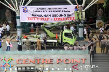 Sejumlah petugas gabungan Polisi, TNI dan Satpol PP menyegel bangunan Mall Center Point di Medan, Sumatera Utara, Rabu (15/5/2024). Pemerintah Kota Medan menyegel Mall Canter Point karena menunggak pajak senilai Rp250 miliar. ANTARA FOTO/Yudi Manar/rwa.