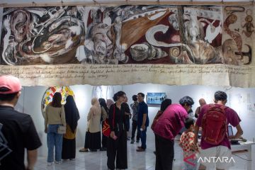 Sejumlah pengunjung mengamati aneka karya interpretasi seniman tentang megalit yang dipamerkan pada kegiatan Residensi dan Eksebisi Seribu Megalit di Palu, Sulawesi Tengah, Rabu (15/5/2024). Kegiatan yang diinisiasi Forum Sudut Pandang yang didukung oleh Kemendikbudristi dan diikuti 16 seniman dari berbagai wilayah di Indonesia itu dimaksudkan untuk meningkatkan kesadaran, membuka akses dan mendorong apresiasi masyarakat terhadap ruang publik dan keragaman nilai budayanya. ANTARA FOTO/Basri Marzuki/wpa.