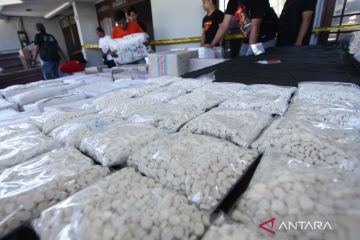 Polisi menata barang bukti saat ungkap kasus industri rumahan narkoba di Surabaya, Jawa Timur, Senin (20/5/2024). Ditresnarkoba Polda Jawa Timur menangkap dua tersangka atas kasus dugaan memproduksi narkoba berupa pil berbagai jenis dan mengamankan barang bukti pil carnophen, pil double L dan pil ekstasi dengan jumlah total keseluruhan sebanyak 6.780.000 serta sabu seberat sekitar 9 kilogram. ANTARA FOTO/Didik Suhartono/YU
