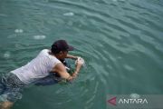 Warga memegang ubur-ubur saat mengunjungi Pantai Mayangan di Probolinggo, Jawa Timur, Rabu (23/5/2024). Fenomena kemunculan ubur-ubur di pesisir pantai tersebut diperkirakan karena perubahan suhu air laut pada masa peralihan musim. ANTARA FOTO/Irfan Sumanjaya/rwa.