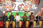 Anggota KPU Idham Holik (ketiga Kanan) bersama Pj Gubernur Jawa Barat Bey Machmuddin (kedua kanan), dan Ketua KPU Provinsi Jawa Barat Ummi Wahyuni (kanan) beserta anggota memukul alat musik gendang saat Peluncuran Pemilihan Gubernur dan Wakil Gubernur Jawa Barat Tahun 2024 di Gedung Sasana Budaya Ganesha, Bandung, Jawa Barat, Senin (27/5/2024). Acara yang digelar KPU Jawa Barat itu sebagai rangkaian sosialisasi proses penentuan pemimpin Jawa Barat dengan tema yakni âPilgub Jabar 2024 sebagai Inisiasi Budaya Demokrasi-Gembira Memilih Langsung pada pemilihan kepala daerah serentak 27 November mendatang. ANTARA FOTO/Novrian Arbi/aww.
