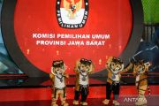 Petugas PPK menunjukkan logo dan maskot saat mengikuti Peluncuran Pemilihan Gubernur dan Wakil Gubernur Jawa Barat Tahun 2024 di Gedung Sasana Budaya Ganesha, Bandung, Jawa Barat, Senin (27/5/2024) Acara yang digelar KPU Jawa Barat itu sebagai rangkaian sosialisasi proses penentuan pemimpin Jawa Barat dengan tema yakni “Pilgub Jabar 2024 sebagai Inisiasi Budaya Demokrasi-Gembira Memilih Langsung” pada pemilihan kepala daerah serentak 27 November mendatang. ANTARA FOTO/Novrian Arbi/aww.