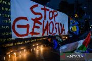 Aktivis yang tergabung dalam Solidaritas Seni untuk Palestina menyalakan lilin saat aksi Hari Berkabung Internasional untuk Palestina di Monumen Solidaritas Asia Afrika, Bandung, Jawa Barat, Rabu (29/5/2024). Mereka mengecam tindakan Israel yang membombardir tenda pengungsi di Rafah, Palestina pada 26 Mei lalu dan mengusulkan kepada pemerintah untuk memperingati sebagai Hari Berkabung Internasional untuk Palestina. ANTARA FOTO/Raisan Al Farisi/Spt.
