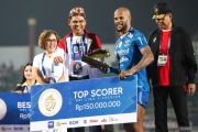 Regional CEO Bank BRI Setiyarta (kedua kiri) menyerahkan trofi pencetak gol terbanyak BRI-Liga 1 2023/2024 kepada pesepak bola Persib Bandung David Da Silva (kedua kanan) disaksikan Anggota Exco PSSI Rudi Yulianto (kanan) dan Direktur Programming SCM Harsiwi Achmad (kiri) di Stadion Gelora Bangkalan, Bangkalan, Jawa Timur, Jumat (31/5/2024). ANTARA FOTO/Rizal Hanafi/YU